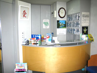 こちらは、受付です。診察カードをお預りします。初めての方は、まず簡単な問診表の記入をして頂きます。当医院は全て時間診療予約制ですので、殆どお待たせしないシステムとなっております。