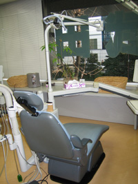 診療室は、正面が全面ガラス張りの明るく開放的な空間となっています。各チェアー間のスペースを広く取り、プライバシーが守られるように区切られています。