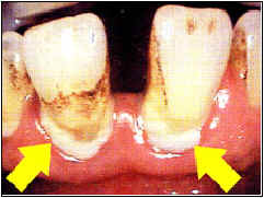 矢印の乳白色の部分がプラーク(歯垢)です